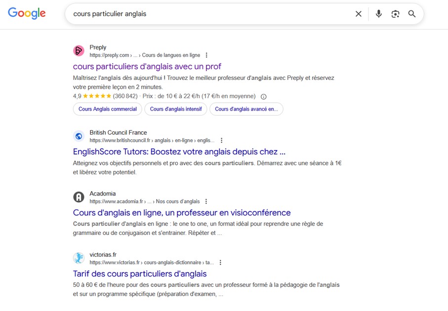 Lors d’une recherche pour « cours particulier anglais », la page Preply apparaît à la fois dans les aperçus sponsorisés de Google et comme premier résultat organique. Ce bon classement témoigne de la forte pertinence de la page vis-à-vis des critères de Google (EEAT) et même du SEO assisté par IA (AI SEO).