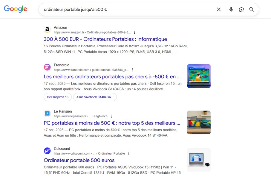 La landing page de Frandroid, qui cible la recherche « ordinateur portable jusqu’à 500 € », adopte un format de guide comparatif clair et orienté achat. Dès l’introduction, le texte présente les principaux critères de sélection et aide l’utilisateur à identifier les modèles offrant le meilleur rapport qualité-prix dans cette gamme.