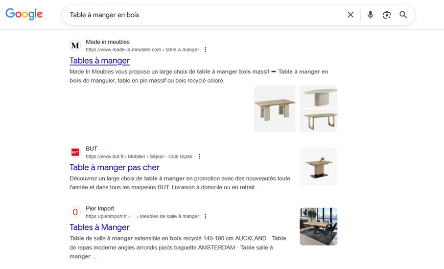 En saisissant la requête produit « Table à manger en bois », la landing page de Made in Meubles affiche une page de catégorie classique avec un large choix de résultats pertinents issus de son catalogue. Chaque produit est illustré par une photo, ce qui facilite la prise de décision. La page présente également des informations claires sur les produits et les prix, accompagnées de filtres et d’options de recherche pour affiner la sélection.