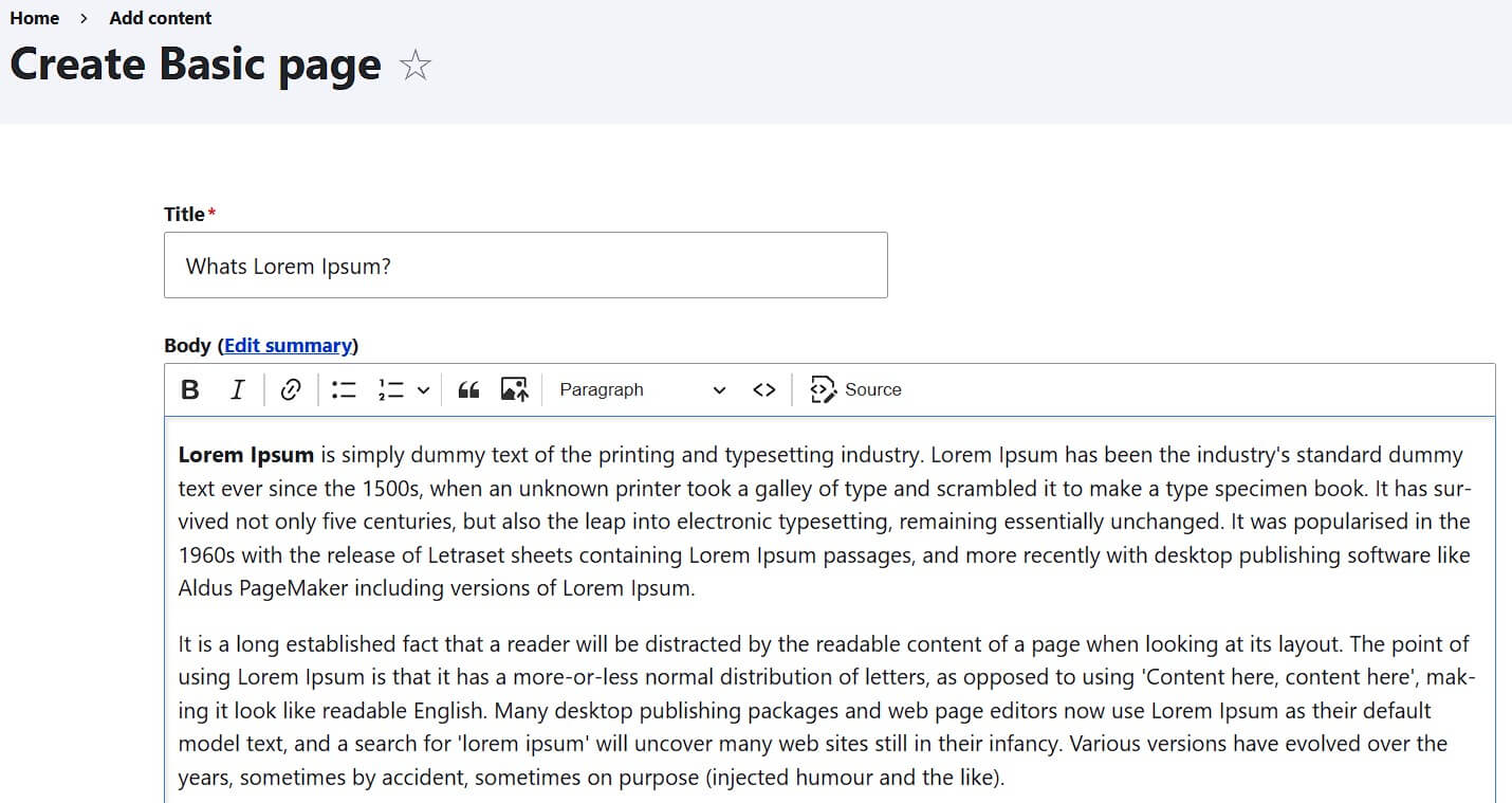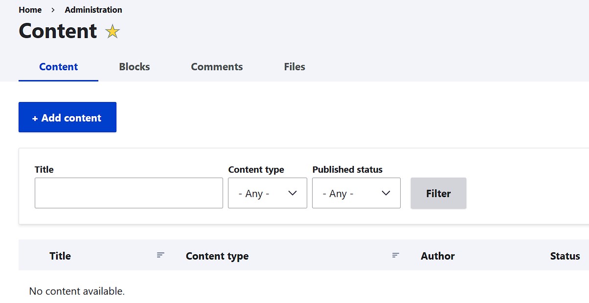 Après avoir terminé la configuration du backend, la gestion des utilisateurs et la sélection de la mise en page, vous disposez désormais de la base idéale pour commencer à créer un site Drupal. La première étape consiste à ajouter de nouvelles pages que vous pourrez enrichir avec du texte, des images ou des vidéos. Pour créer une page, ouvrez le menu « Contenu » puis cliquez sur « Ajouter du contenu » :