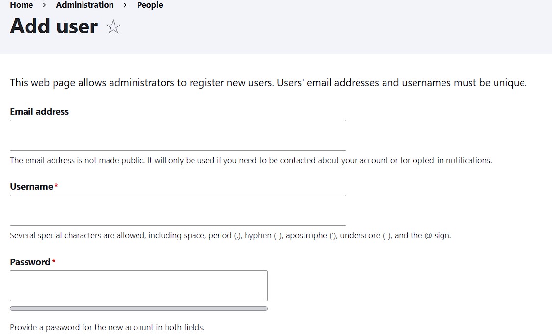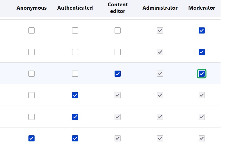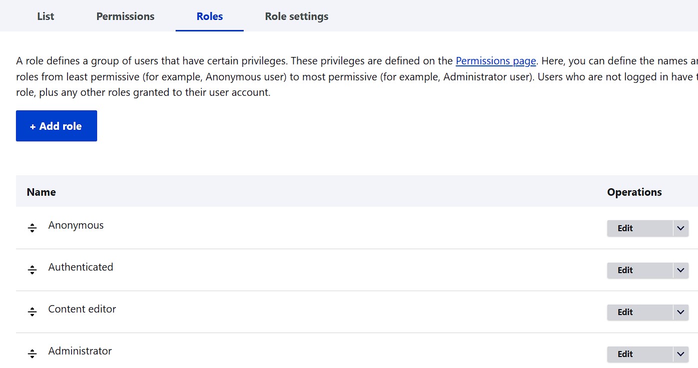 Avant de commencer à créer et concevoir vos pages Drupal, il est recommandé de définir les autorisations des futurs utilisateurs. Le système de gestion de contenu permet de créer des groupes d’utilisateurs auxquels vous pouvez attribuer un ensemble complet de droits. Les comptes nouvellement enregistrés peuvent être assignés à un ou plusieurs de ces groupes, et héritent automatiquement des autorisations correspondantes. Drupal distingue trois types d’utilisateurs au départ :