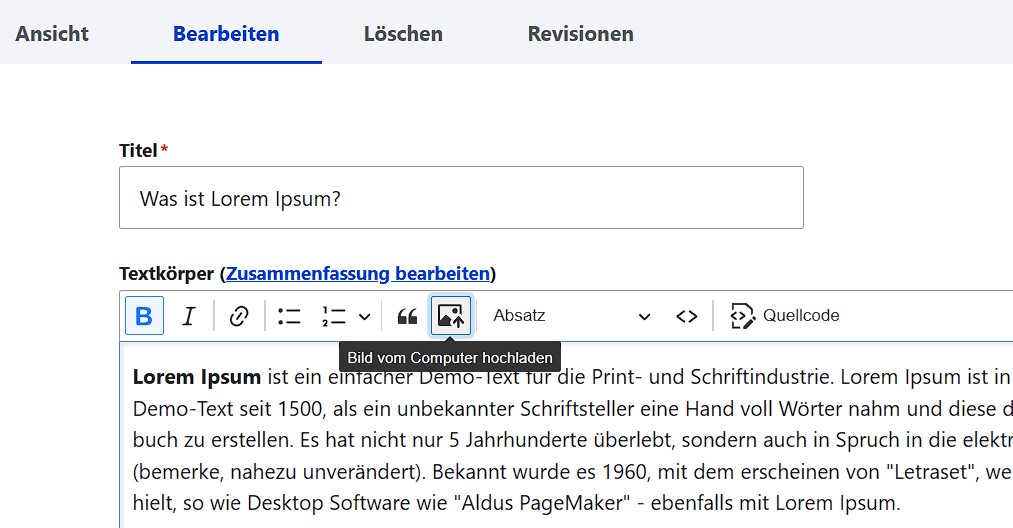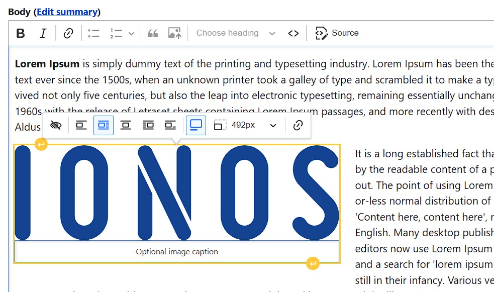 Si vous souhaitez ajouter des images à un texte sur votre site Drupal nouvellement créé, ouvrez l’éditeur pour la page correspondante. Pour ce faire, recherchez simplement cette page dans le menu « Contenu » et appuyez ensuite sur « Modifier ». Vous disposez à présent des mêmes options de paramétrage que lors de la création de la page et donc également de l’accès à l’éditeur WYSIWYG. Avec cet outil, vous pouvez structurer le texte de la page comme dans un éditeur de texte ordinaire, en utilisant des mises en gras, italiques, des titres ou des listes à l’aide de la barre de menu. De plus, il est possible d’intégrer des photos et des images. Pour ce faire, cliquez d’abord sur l’icône d’image :