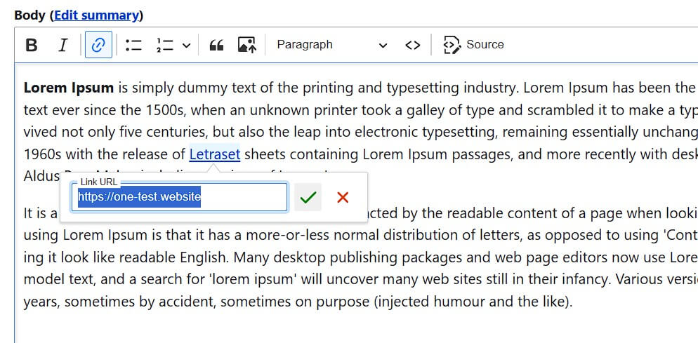 De plus, l’éditeur Drupal vous permet d’insérer des liens en cliquant d’abord sur l’icône Lien et en saisissant l’URL cible souhaitée. Ensuite, vous confirmez le lien en cliquant sur la coche verte ou en appuyant sur la touche Entrée.