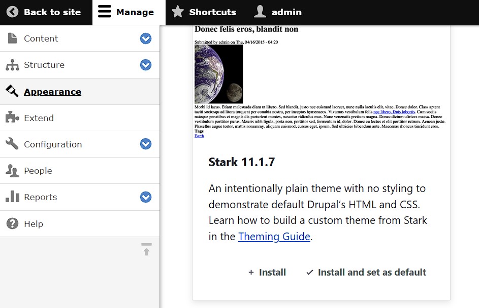 Cliquez sur « Installer et définir par défaut » pour installer le thème choisi et l’appliquer comme thème principal de vos pages Drupal. Terminez en cliquant sur « Enregistrer la configuration » pour valider votre choix.