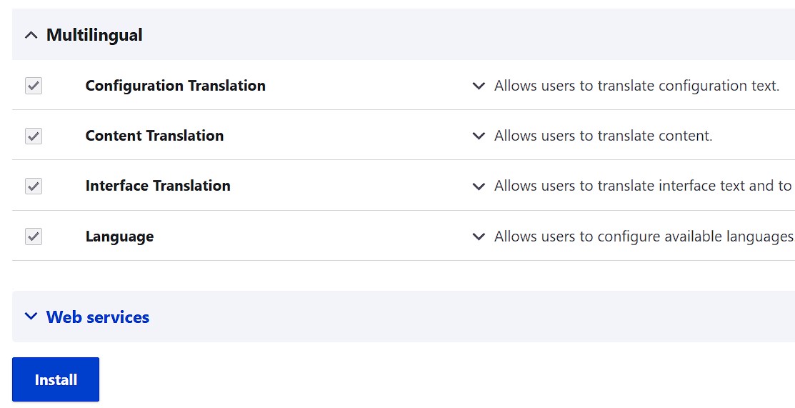 - Faites défiler jusqu’à la rubrique « Multilingual » et cochez les quatre modules de langue et de traduction disponibles.