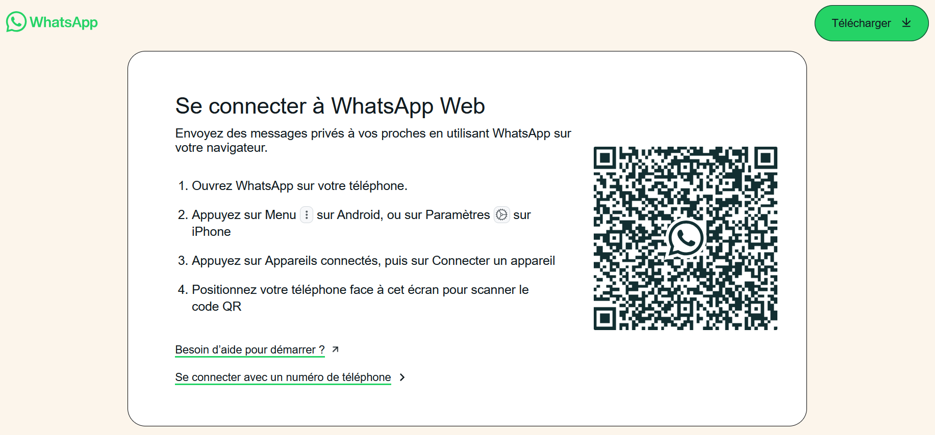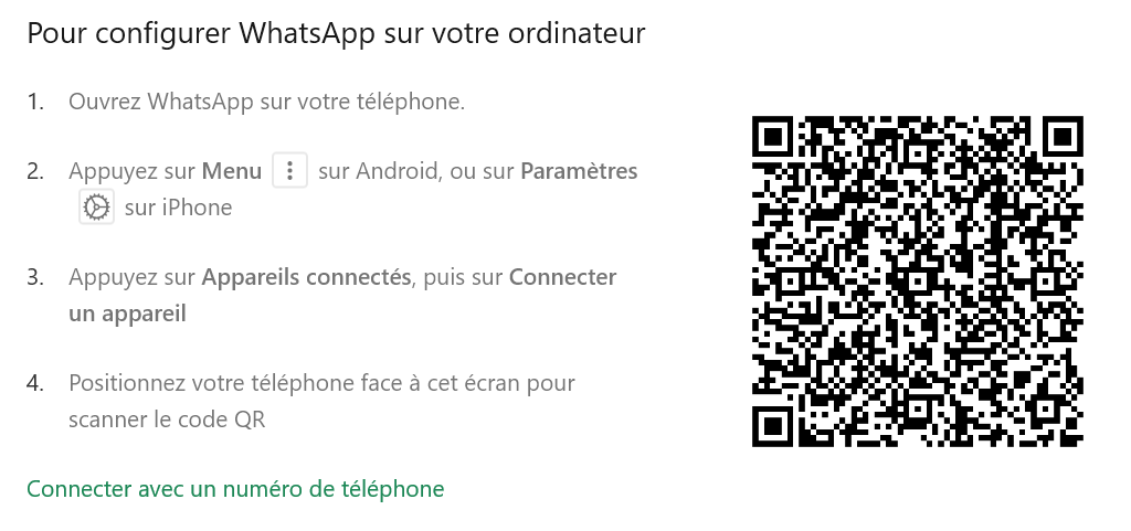 - Lancez WhatsApp Web dans votre navigateur. Un guide d’installation s’ouvre, y compris un code QR.