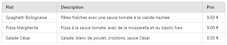 Pour illustrer les possibilités offertes par les balises de tableau, prenons un exemple simple de tableau HTML avec les descriptions et les prix de trois plats. Dans l’en-tête, nous définissons les trois titres de colonne « Plat », « Description » et « Prix ». Les trois lignes suivantes contiennent les détails des plats. Au total, le tableau HTML comporte donc quatre lignes et trois colonnes :