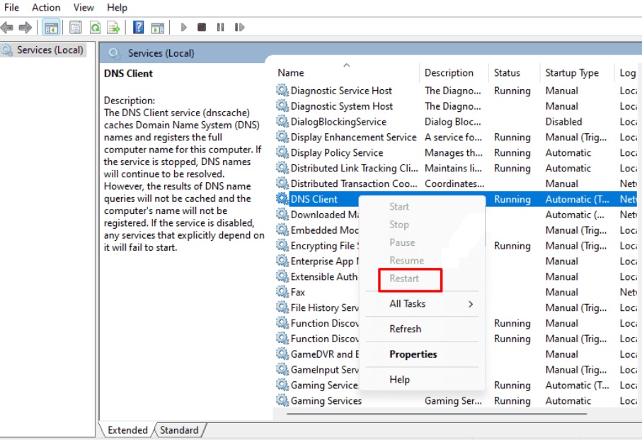 - Si le service n’est pas en cours d’exécution, sélectionnez l’entrée du Client DNS avec un clic droit et cliquez sur « Redémarrer ».