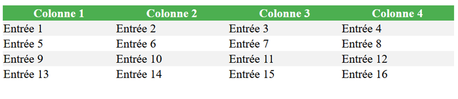 Le code CSS est intégré dans l’en-tête à l’aide de la balise <style>. Dans l’exemple suivant, nous indiquons que l’en-tête du tableau doit avoir un fond vert, tandis que les autres lignes doivent alterner entre un fond gris clair et blanc :
