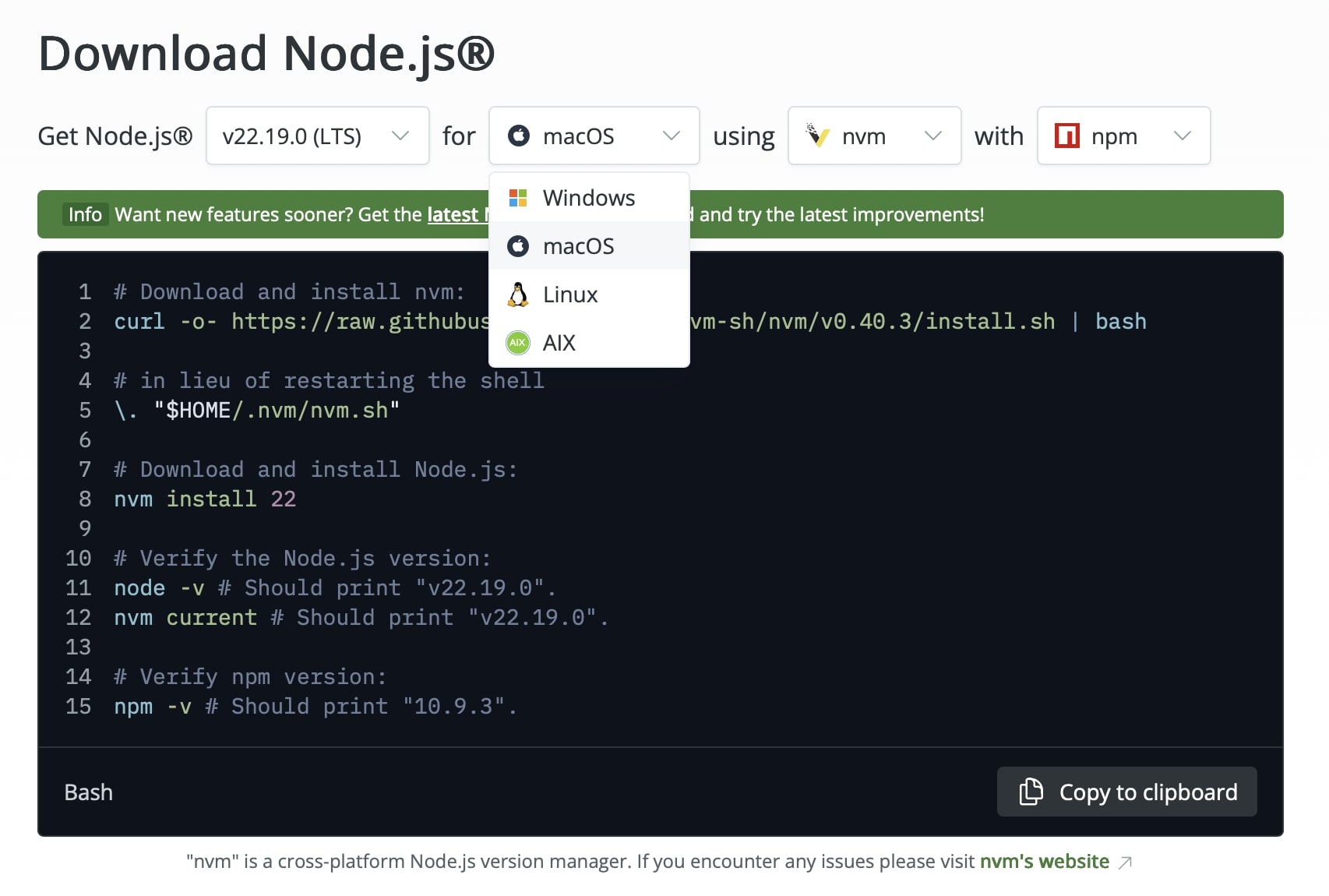 npm -vbashSi les deux commandes renvoient un numéro de version, Node.js est correctement installé et prêt à être utilisé. Vous pouvez désormais exécuter vos propres scripts JavaScript ou lancer des serveurs Web avec Node.js.