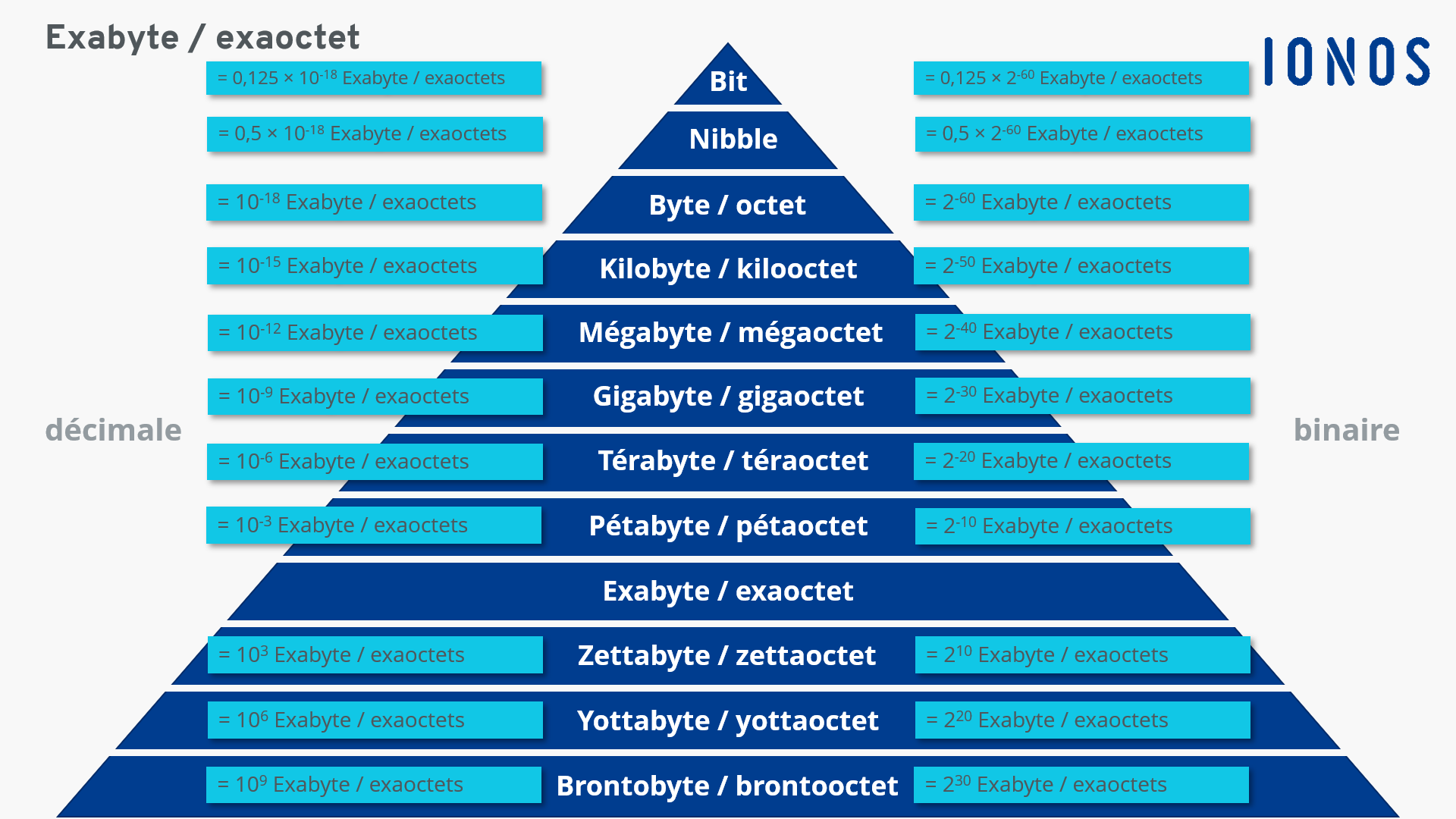 | Exabyte (EB) ou Exaoctet (Eo) | 1 000 000 000 000 000 000 (1018) |