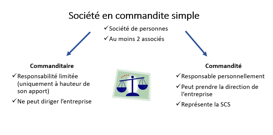 Une société en commandite simple, en abrégé SCS, est une société fondée par deux personnes physiques ou morales au minimum, qui ont pour objet une activité commerciale. Une SCS se compose toujours d’un associé personnellement responsable, le commandité, et d’un associé qui n’est responsable qu’à concurrence du montant de l’apport effectué, le commanditaire. Alors que l’associé commandité, qui est responsable avec son patrimoine privé, gère entièrement la société, le commanditaire n’a aucun pouvoir de décision dans la société.