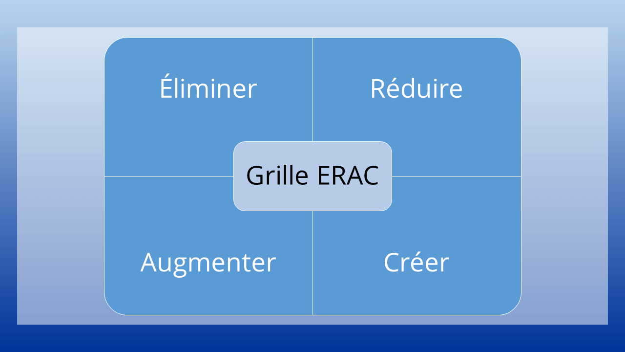 Il s’agit maintenant de mettre en œuvre les conclusions. La grille ERAC ou (grille des quatre actions) est utilisée. La méthode apporte quatre leviers avec lesquels vous pouvez ajuster le produit pour développer une innovation et créer un nouveau marché :
