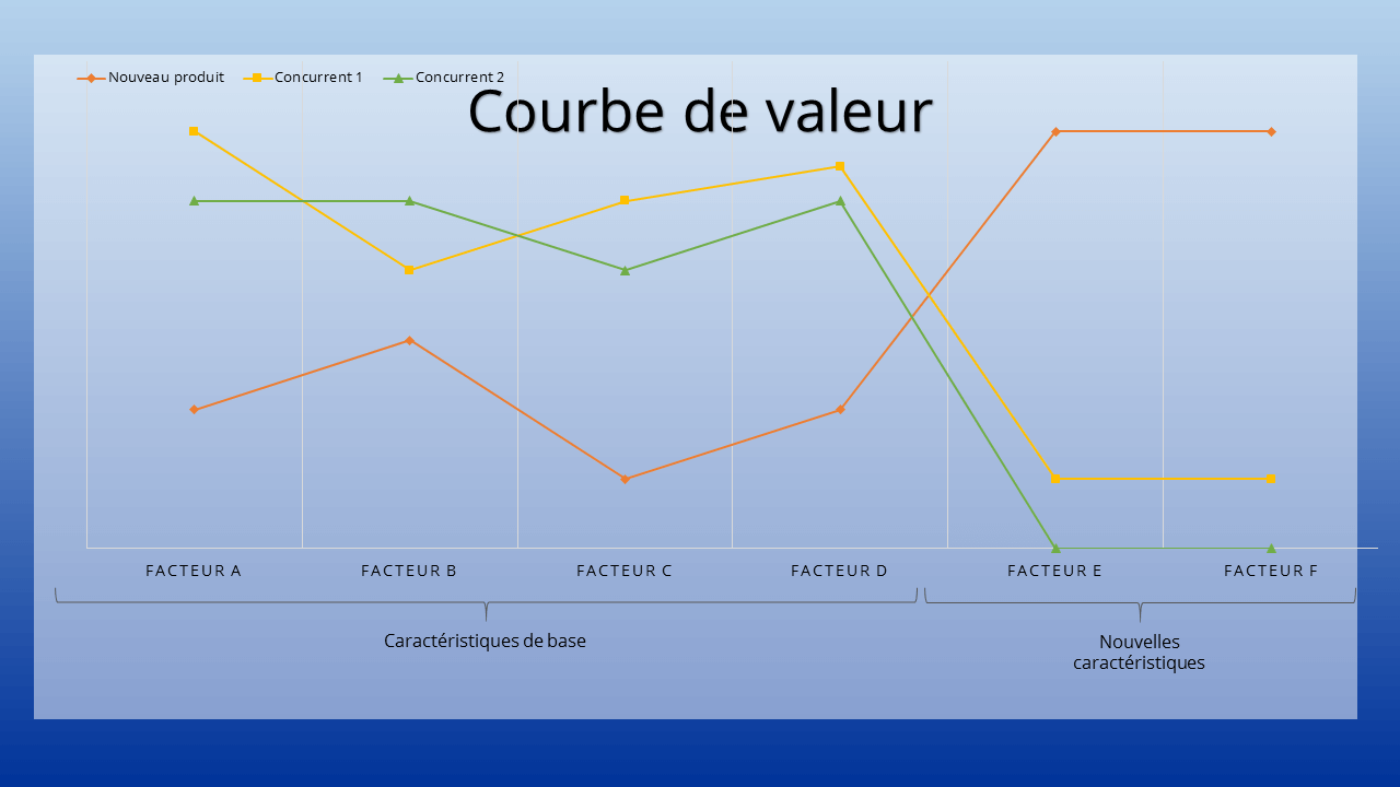 Pour que la stratégie Blue Ocean soit réussie, il est donc conseillé d’analyser les souhaits du groupe cible : qu’attendent les consommateurs d’un nouveau produit ? Les résultats peuvent être présentés sous la forme d’une courbe de valeur. Vous disposez ici différentes caractéristiques d’un produit sur un axe et symbolisez l’importance ou le degré de maîtrise dans l’autre axe. Vous pouvez maintenant saisir les données du consommateur dans le système de coordonnées. De plus, vous analysez également les offres de la concurrence au sein de l’industrie. De cette façon, vous pouvez présenter les changements nécessaires par rapport aux produits existants afin de développer une innovation en lien avec la stratégie Blue Ocean.