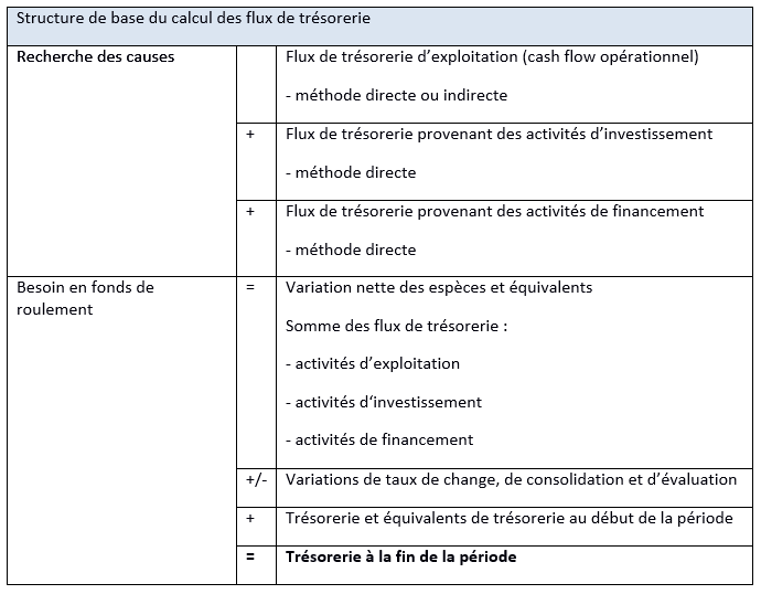 Le tableau suivant nous montre la structure de base du calcul des flux de trésorerie. Les données tiennent compte du standard international IAS7.