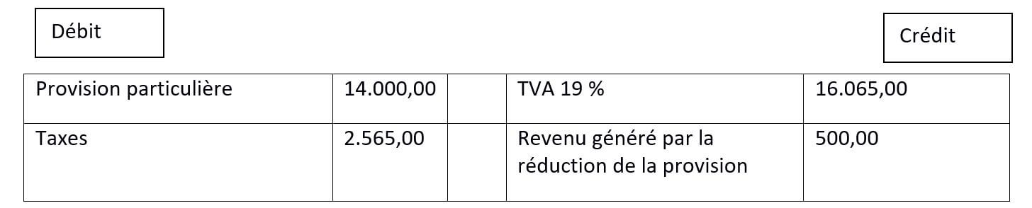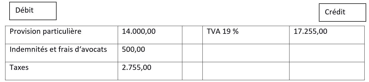 Dans la mesure où le jugement a été rendu et que vous connaissez la somme qu’il vous incombe de payer, il n’est pas nécessaire de garder la provision, mais au contraire de la dépenser à cette fin : il faut donc inverser l’état actuel et verser l’intégralité du montant de la provision, soit 14 000 €, sur le compte débiteur, et de l’inscrire dans la colonne de gauche. La somme totale à payer, taxes comprises, s’élève à 17 255 €, dont 2.755 € de taxes qui seront payées au Trésor Public ultérieurement et doivent donc être déduites de la facture dans l’immédiat.