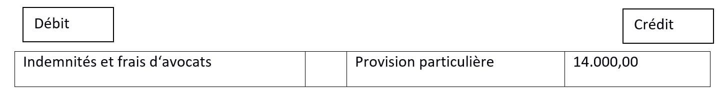 L’entrée d’argent de 14 000 € se trouve donc dans la colonne des crédits, sous l’intitulé « provision particulière ». Dans la colonne des débits sont mentionnés les « indemnités et frais d‘avocats »
