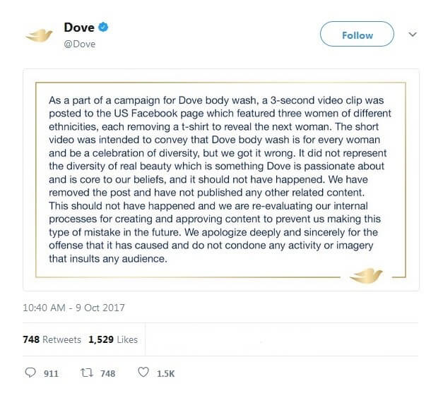 De nombreux clients accusent l'entreprise d'avoir commis une grave erreur morale d'une part et, d'autre part, d’avoir manqué de sensibilité dans l’approche d’une partie de sa cible. De plus, l'image qui en résulte est contraire à la corporate identity dont se défend l’entreprise, qui se considère comme inclusive et sûre d'elle. Pour limiter les dégâts, Dove a décidé de publier des excuses sur Twitter :