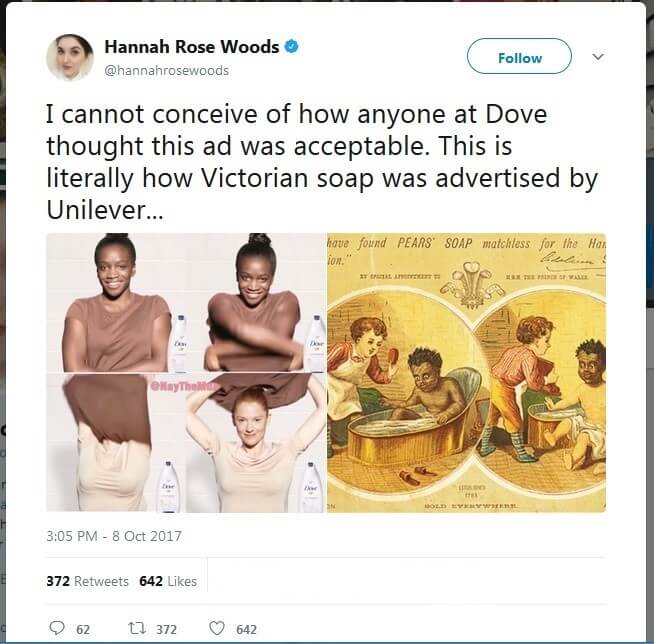 Selon Dove, l'objectif de la vidéo, qui a été publiée sur Facebook aux États-Unis, était de présenter la politique inclusive de l'entreprise. L'ordre dans lequel les modèles apparaissent, cependant, associée à l'image du savon, permettait d'interpréter que la peau foncée serait blanchie par le produit. L'effet avant/après image suggère que l'éclaircissement de la peau serait une amélioration. La publicité rappelle notamment des publicités de la fin du XIXe siècle créées par Unilever, la maison mère de Dove, où le racisme est clairement palpable. Les parallèles dans les représentations évoquent douloureusement des connotations racistes. Les utilisateurs de Twitter l'ont signalé à Dove :