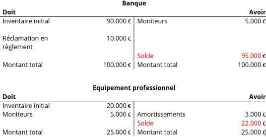 L'achat immédiatement payé des moniteurs peut désormais être comptabilisé directement, dans le cas le plus simple, comme une augmentation de la valeur de l'équipement de l'entreprise contre une réduction du solde bancaire : matériel de bureau à la banque : 5 000 €. (Dans la pratique, toutefois, le montant brut payé serait divisé en montant net en tant qu'augmentation de la valeur du matériel de bureau et la taxe en amont à rembourser par l'administration fiscale en tant que créance et comptabilisée en conséquence).