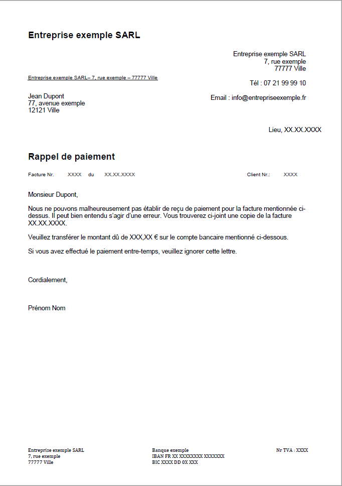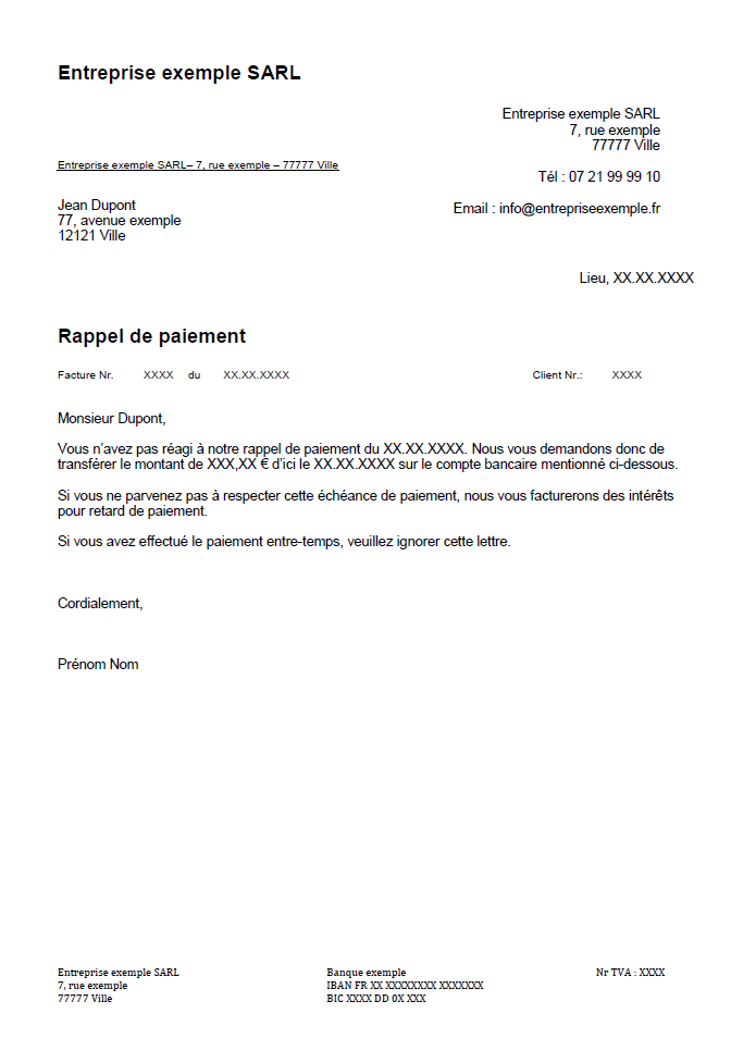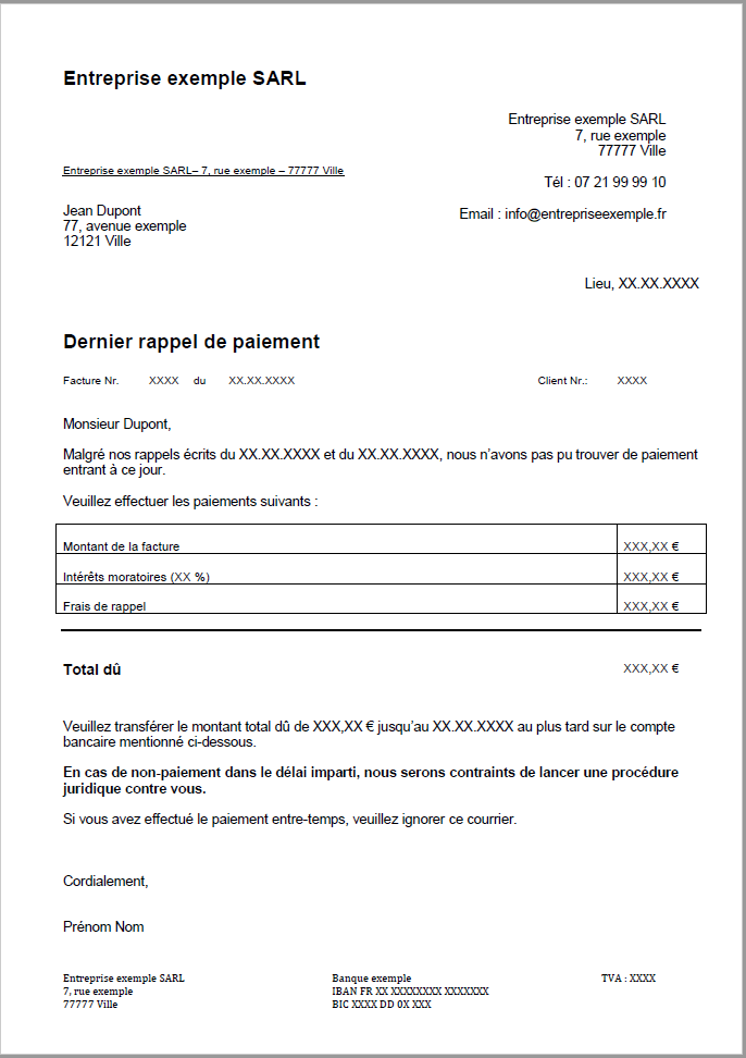 Cette lettre constitue souvent la première étape d’une demande de paiement. Comme évoqué précedemment, inutile de mentionner des sanctions juridiques ou lois en vigueur. La seule référence que vous pouvez utiliser est celle de vos conditions générales de vente, acceptées par le client. Rappelez simplement la somme à payer.