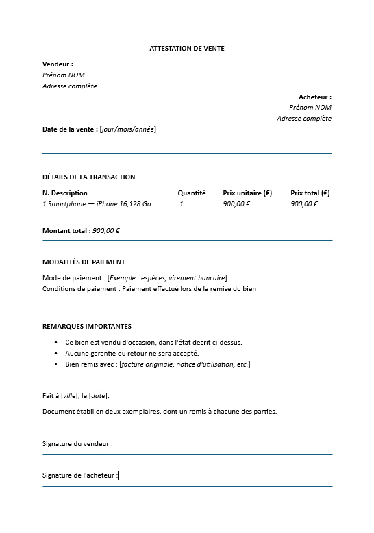 Pour vous simplifier la tâche, nous mettons donc à votre disposition trois modèles d’attestation de vente. Ces documents sont facilement modifiables et peuvent être adaptés à divers biens. Dans nos exemples, il s’agit de la vente d’un iPhone, d’une voiture et d’une table. Les éléments en italique sont à personnaliser avec les informations spécifiques à votre transaction, afin de garantir que tous les détails essentiels sont pris en compte et protègent les intérêts des deux parties.