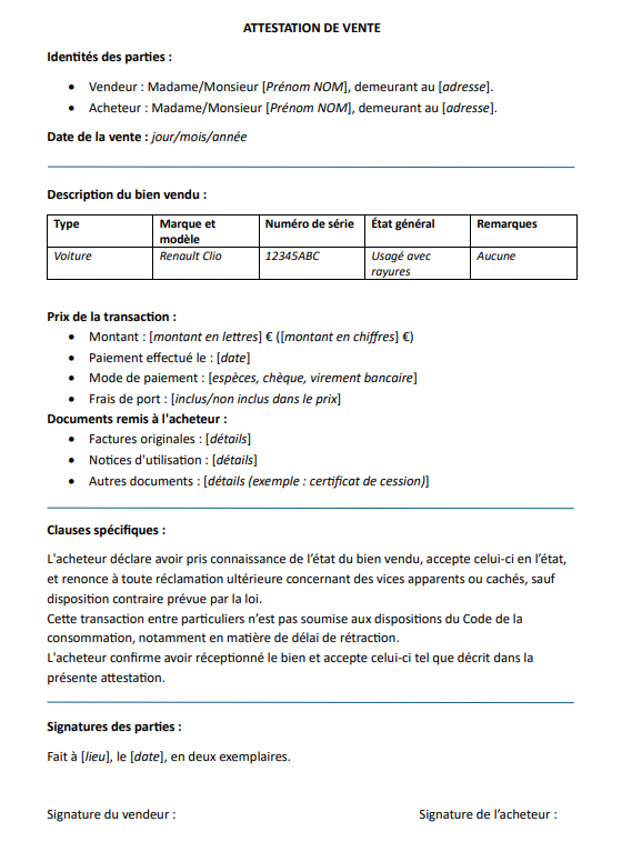 Pour être juridiquement valable, l’attestation de vente doit refléter l’accord des deux parties et inclure des informations détaillées telles que :