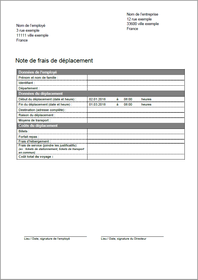 Vous pouvez télécharger gratuitement notre modèle de frais de déplacement en format Word. Les salariés peuvent soit imprimer le modèle et le remplir manuellement, soit compléter les entrées dans le formulaire directement sur leur PC.