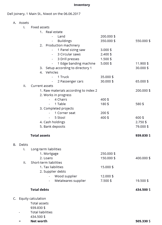 Pour une meilleure compréhension, nous vous donnons un exemple de la façon dont un inventaire est structuré correctement. Bien entendu, chaque inventaire doit être adapté aux conditions de l’entreprise. Dans ce cas, nous montrons l’inventaire d’une entreprise de menuiserie fictive.