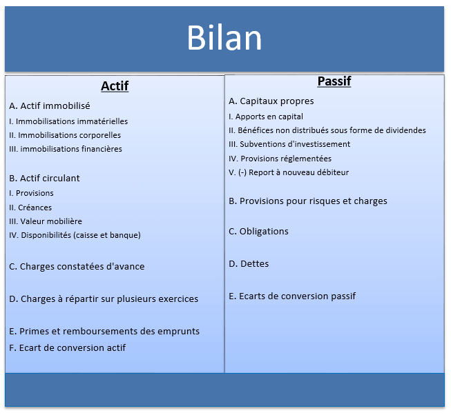 Le bilan est composé d’un actif et d’un passif. La partie actif énumère tous les processus commerciaux, qui relèvent de l’utilisation de vos ressources : machines, matériels de production, etc. La partie passif au contraire réunit tous les processus qui relèvent de l’origine de ces ressources : cela implique le capital propre, les crédits, les gains sur un exercice, etc. Cette confrontation de ces deux parties aide à garder un aperçu des domaines dans lesquels l’argent est dépensé, et ceux dans lesquels il est obtenu.