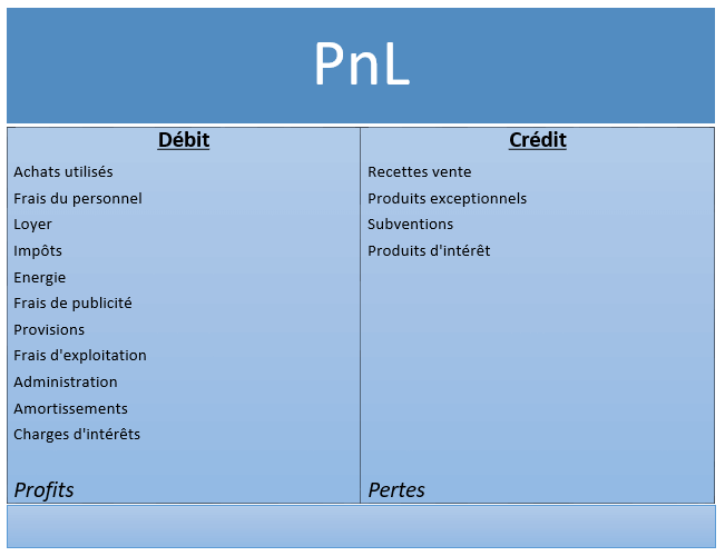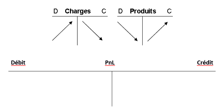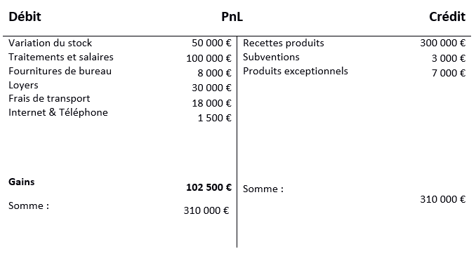 le compte du PnL est pour ainsi dire le compte des capitaux propres et se trouve ainsi du côté du passif. Faites bien attention lors du calcul du PnL à bien placer les produits dans la partie crédit et les charges dans la partie débit. Les valeurs ainsi obtenues dans le PnL sont reportées à la fin de l’année comptable dans le compte des capitaux propres.