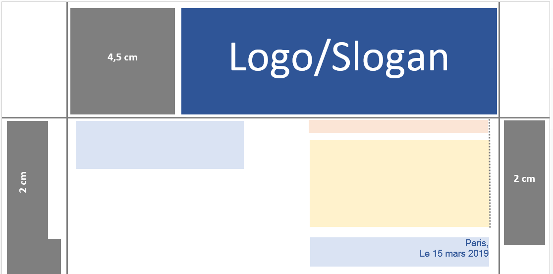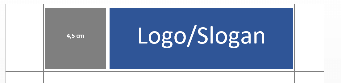 L’en-tête correspond au bord supérieur du document. À partir de ce dernier, 4,5 cm peuvent être utilisés librement pour l’identification de votre entreprise. Généralement, des éléments graphiques tels que des logos ou slogans de la société sont placés dans cette zone.