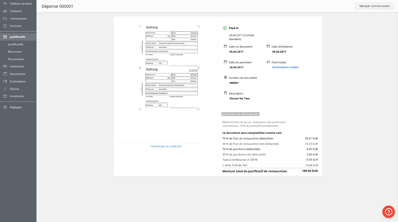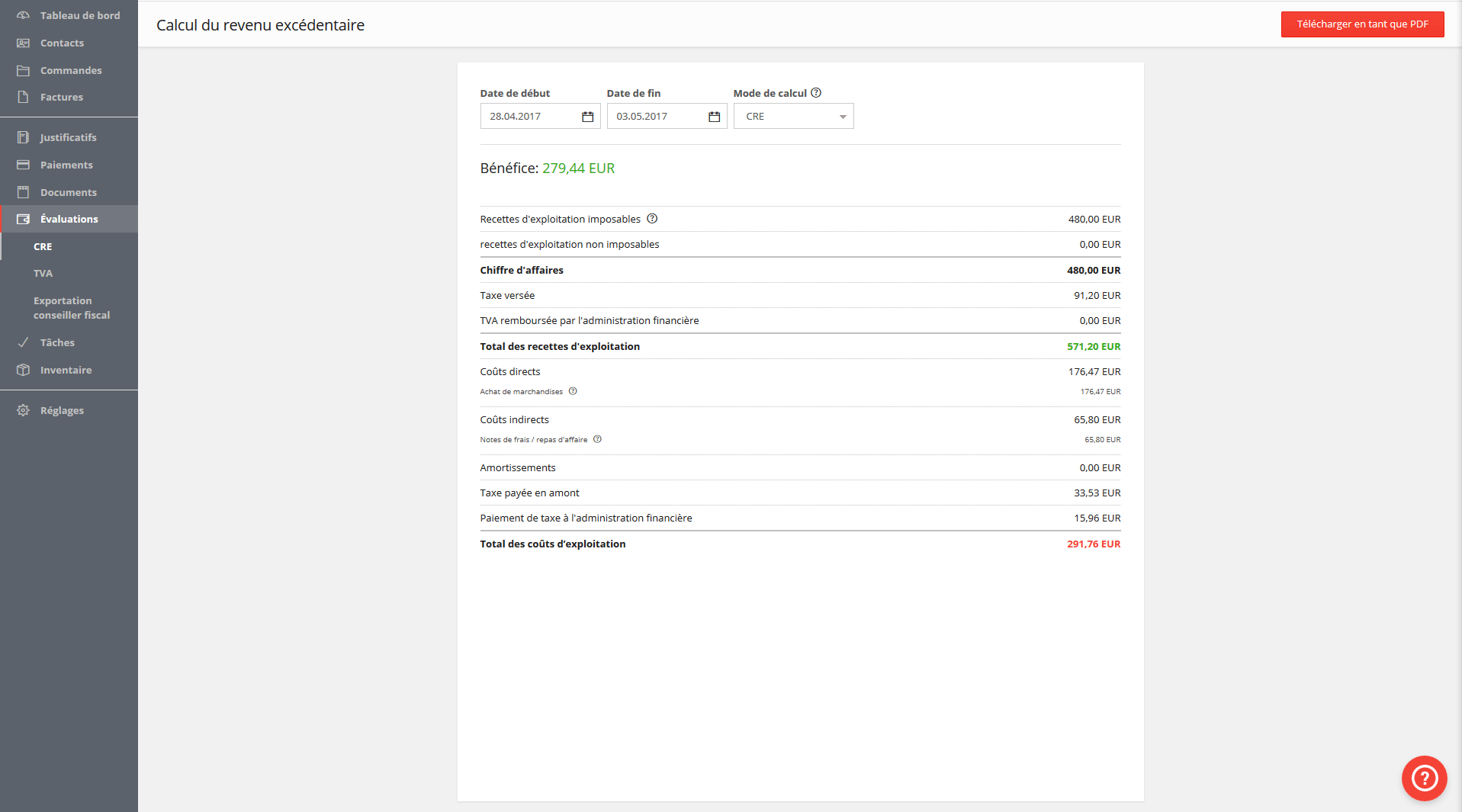 Avec le calcul du revenu excédentaire, vous pouvez voir sur une certaine période de temps la situation économique de votre entreprise : il suffit simplement de définir la période et l’application vous présente votre bilan. Tous revenus et dépenses pertinents sont affichés par le système et sont pris en compte dans le calcul de l’excédent de revenu. Il est évidemment possible de l’exporter ensuite en format PDF.
