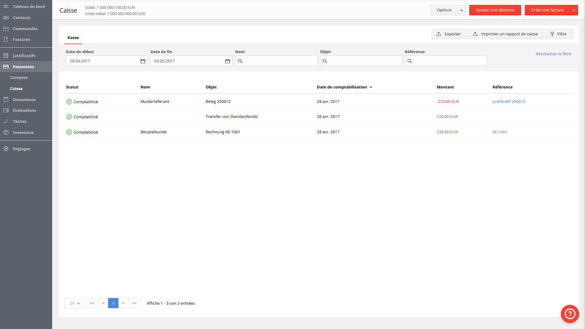 Un livre de caisse doit contenir tous les paiements entrants et sortants. Le logiciel répertorie automatiquement les dépenses et les revenus des documents capturés, ainsi que les frais d’affranchissement et les virements bancaires réalisés (si vous vous connectez à votre compte bancaire en ligne avec l’application, vous pouvez réaliser des transferts directement via le programme). Avec ce logiciel de gestion comptable il est très facile de réaliser un livre de caisse journalier ou mensuel.