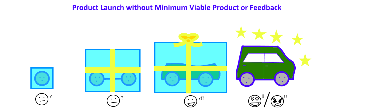 Si l’on ne comprend pas le principe du produit minimal viable, on peut dire qu’on risque d’agir comme un lancement de produit sans MVP, mais où le concepteur cherchera à vendre la première roue à son client. Cette première roue n’est pourtant pas en mesure de satisfaire les besoins du client. Le client cherche un moyen de locomotion. C’est aussi le cas des deux lancements de produit suivants qui ne règlent pas le problème. Ils n’offrent toujours pas de moyen de déplacement utilisable. Il ne semble pas que les concepteurs aient eu recours au feedback de leurs clients. Si cela avait été le cas, le deuxième essai (le châssis vide d’un véhicule) aurait au moins été équipé d’un siège ou d'un moteur. Ils parviennent cependant à fabriquer un produit fini. Mais le smiley en dessous de l’image traduit en fait davantage les espoirs optimistes des concepteurs que la réalité. Car en tant que startup sans clientèle existante, les concepteurs n’auraient pas réussi, au premier lancement de produit, à livrer à leur groupe-cible le moindre produit satisfaisant. Habituellement, les consommateurs n’auront pas la patience d’attendre le quatrième essai d’une entreprise pour enfin pouvoir leur commander un produit utilisable. Un consommateur se détournera très vite d’une telle entreprise.