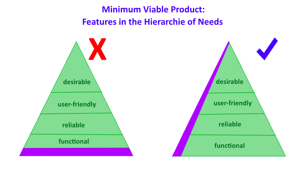 La pyramide des besoins, plus connue sous le nom de Pyramide de Maslow, montrent les exigences minimales qu’un produit minimal viable doit satisfaire. Pour qu’un client achète un produit, il faut que ce produit réponde à un besoin. Le client doit par ailleurs avoir le sentiment qu’il lui manque quelque chose. Une fois qu’ils ont couvert leurs besoins essentiels comme se nourrir, dormir et être en sécurité, la plupart des gens recherchent autre chose, par exemple une touche de luxe ou une reconnaissance sociale. On peut représenter la demande de tels produits ou de telles prestations dans des pyramides de besoins.