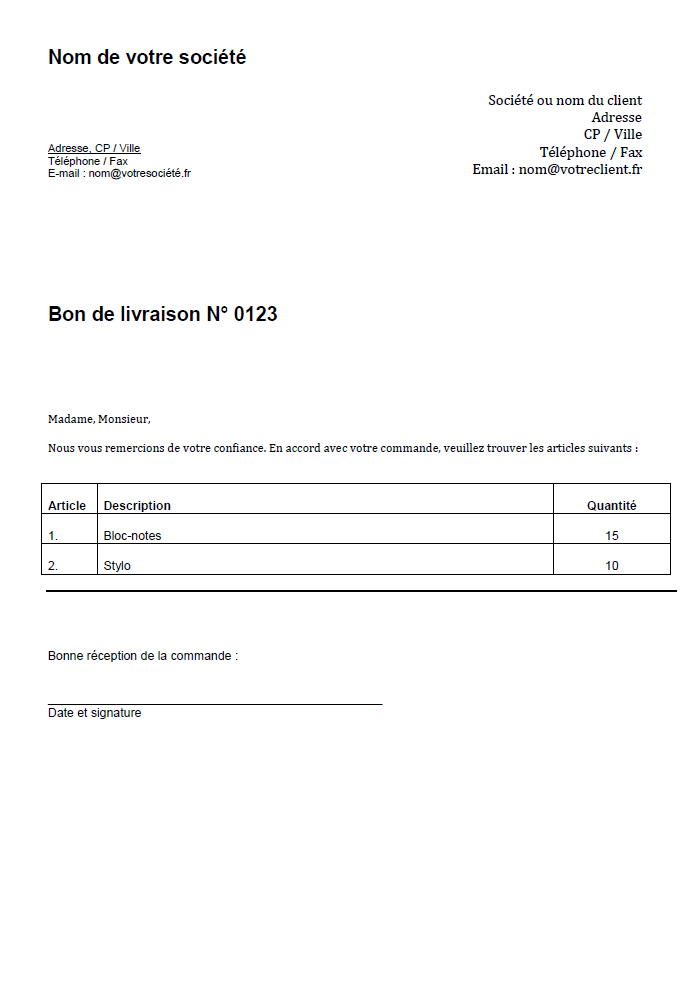 Du modèle de bon de livraison au bordereau de marchandises