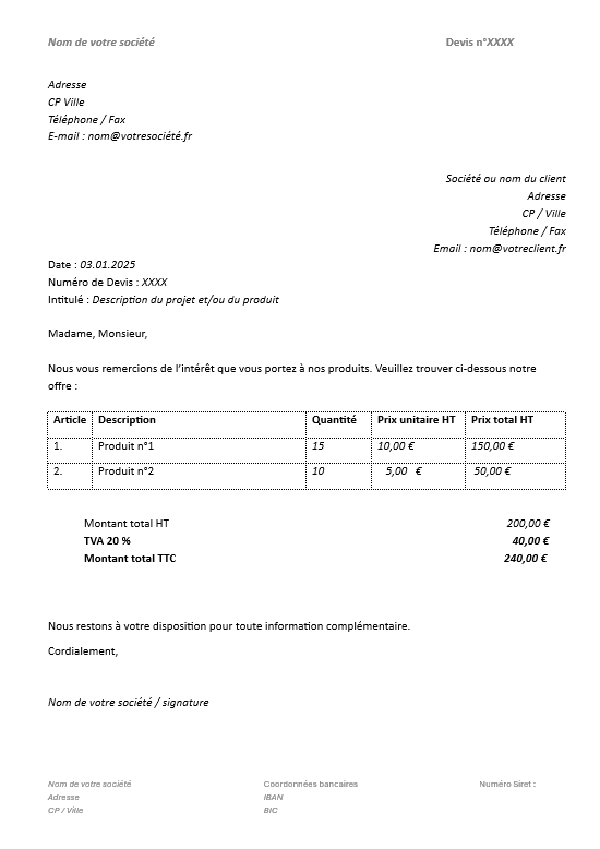 En utilisant ces templates de devis, vous gagnez un temps précieux pour rédiger vos offres commerciales. Quel que soit le modèle que vous choisissez, il est essentiel de suivre certaines étapes importantes. Il peut être nécessaire de personnaliser des espaces réservés, des phrases types ou des valeurs qui doivent toutefois rester inchangées. Par conséquent, veillez à être attentif et précis et prenez le temps de bien comprendre la structure et les éléments clés de votre devis avant de le personnaliser. Dans nos exemples, les éléments en italique doivent être remplacés par vos informations réelles.