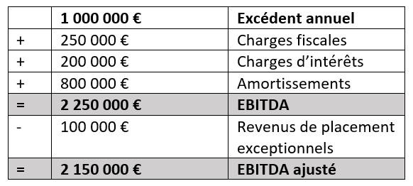 Étant donné que la seconde entreprise doit payer moins d’impôts malgré un excédent annuel identique, et qu’elle enregistre par ailleurs des coûts bien inférieurs en termes d’intérêts et d’amortissements, son EBITDA est quelque peu inférieur à celui de la première entreprise. On peut donc considérer que la seconde entreprise a un succès inférieur dans ses activités commerciales que la première. Dans le cas de la seconde entreprise, l’EBITDA ajusté correspond à l’EBITDA non ajusté, puisque l’entreprise n’a enregistré aucun revenu ni aucune charge exceptionnelle au cours de l’exercice.