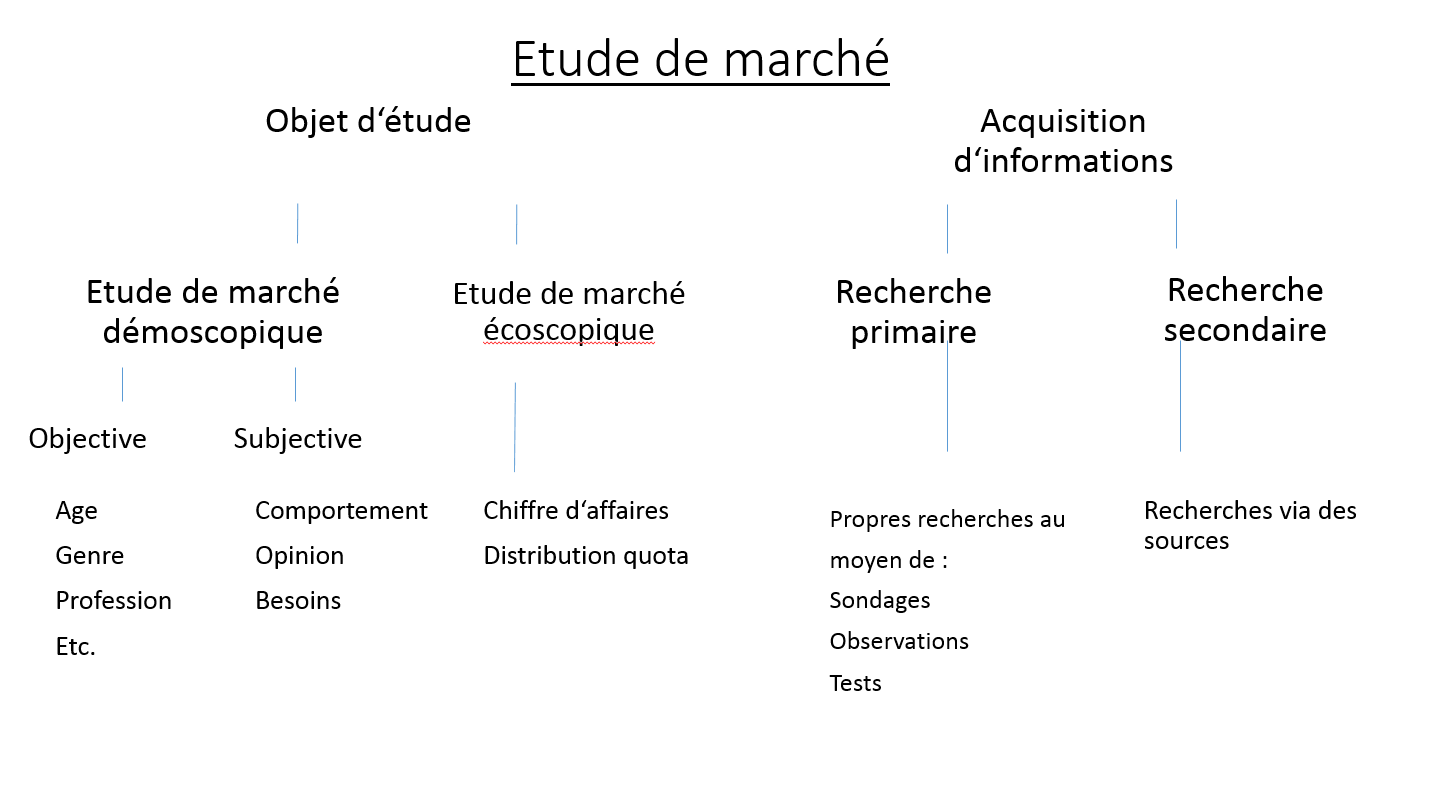 Dans les études de marché, on opère une distinction entre le type « objet d’étude » et le type « acquisition d’informations ». Ces deux types peuvent être divisés à leur tour en deux catégories.