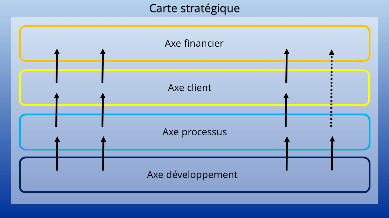 La carte stratégique peut aider l’entrepreneur à formuler la stratégie d’entreprise : on peut par exemple fixer comme objectif principal un chiffre d’affaires déterminé. La question est à présent de savoir comment celui-ci doit être fixé. Une possibilité serait d’augmenter le nombre de nouveaux clients. L’étape suivante consiste à déterminer comment acquérir ces nouveaux clients, ce qui entraîne à nouveau un objectif dans l’axe processus. Finalement, il faut réfléchir aux conditions (et donc aux objectifs) nécessaires dans l’axe développement pour atteindre la valeur cible de l’axe processus. Par conséquent, la carte stratégique se construit du haut vers le bas.