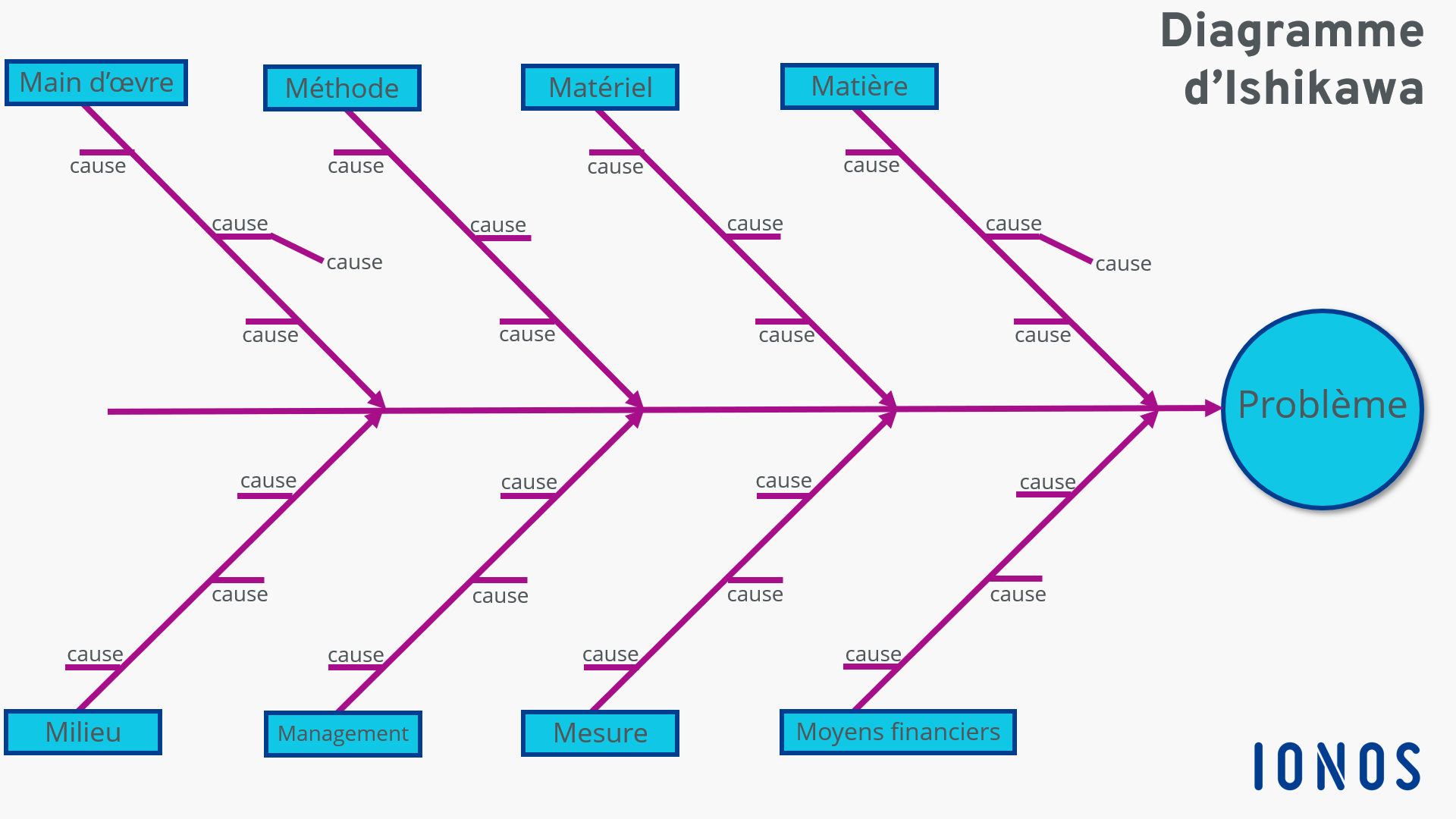 Le diagramme d’Ishikawa, nommé d’après son inventeur Ishikawa Kaoru, un chimiste japonais, vise à aider les entreprises à rechercher les problèmes et leurs causes de manière structurée. C’est pour cette raison que cet outil est également nommé diagramme de causes et effets. Chaque problème pouvant être durablement résolu y est représenté de manière graphique, accompagné de sa cause.