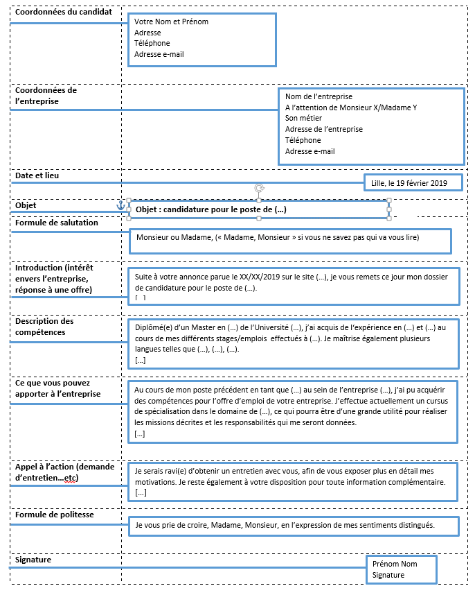 Une certaine structure est établie pour les lettres de motivation et il est important de la respecter. La raison en est la fonction du texte : il doit fournir à la personne responsable les informations les plus importantes sur votre motivation et vos qualifications professionnelles de manière aussi concise et précise que possible. Le graphique suivant illustre la structure de base d’une lettre de candidature.