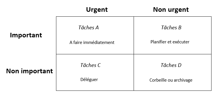 Ce problème a également été identifié par l’ancien président américain Dwight D. Eisenhower. Il a donc développé une méthode de gestion du temps qui consiste en une matrice où les tâches à accomplir sont classées. Eisenhower fait la distinction entre l’importance et l’urgence des tâches.