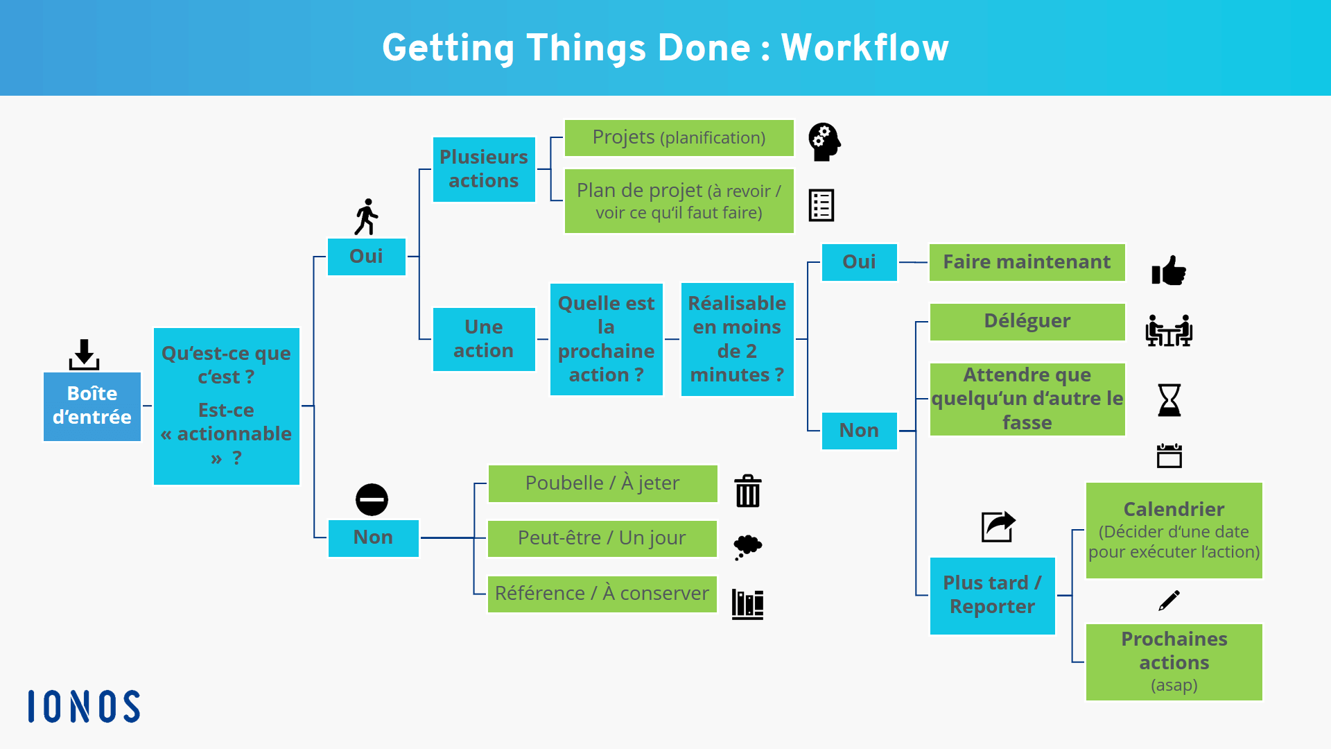 En mettant par écrit toutes les tâches et projets, vous déchargez votre cerveau et vous ne pouvez plus rien oublier. Cette méthode vous permet de traiter chaque nouvelle information ou tâche que vous recevez. Elle se compose de cinq étapes : consigner, traiter, organiser, passer en revue et exécuter.