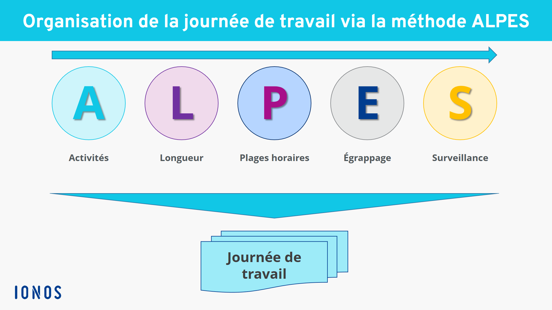 La méthode ALPES ne se consacre pas aux grandes questions de la planification d’entreprise, mais à la meilleure organisation de la journée de travail. Elle vous montre comment la structurer pour un maximum d’efficacité et utilise pour cela cinq étapes qui sont reprises dans le nom de cette méthode.