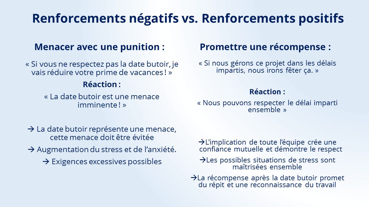 La motivation extrinsèque est un facteur que les supérieurs et managers peuvent influencer. Toutefois, le renforcement négatif ne devrait être utilisé qu’en cas de mauvaise conduite. Il ne serait pas opportun de menacer les employés par mesure de précaution si vous ne gérez pas ensemble un projet important dans un délai raisonnable. Au lieu de cela, une récompense appropriée telle qu’une fête commune ou un jour de vacances supplémentaire sont une meilleure source de motivation. Après tout, la motivation intrinsèque doit être maintenue, et cela se matérialise par des sentiments positifs à l’égard de l’emploi. La menace d’une punition favorise plutôt les peurs et peut conduire à une attitude de défense.