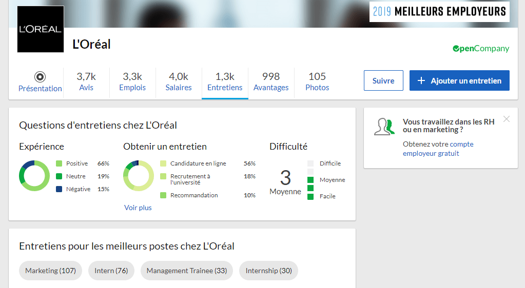 Le portail d’évaluation américain Glassdoor est l’une des plateformes les plus connues et les plus complètes. Fondée en 2007, elle est disponible en français depuis 2014. Glassdoor regroupe à la fois des informations relatives à l’entreprise, des retours d’expérience des salariés, mais aussi des chiffres clés sur le salaire (niveau moyen en fonction du poste, des années d’expérience et de la zone géographique) et des avantages éventuels. Par ailleurs, les évaluations comprennent souvent des avis liés à l’entretien d’embauche, ce qui permet aux postulants de se préparer à leur rendez-vous professionnel.