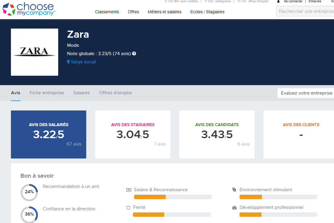 ChooseMyCompany s’est donné le challenge de donner plus de transparence pour naviguer dans le marché de l’emploi. Sa plateforme agréable propose à la fois aux entreprises de se présenter, de publier des offres d’emploi, mais aussi aux employés de donner leur avis. Les commentaires sont clairement distingués selon que vous êtes salarié, stagiaire ou candidat. Même si ce n’est pas le but premier du site, les clients peuvent également donner leur avis.