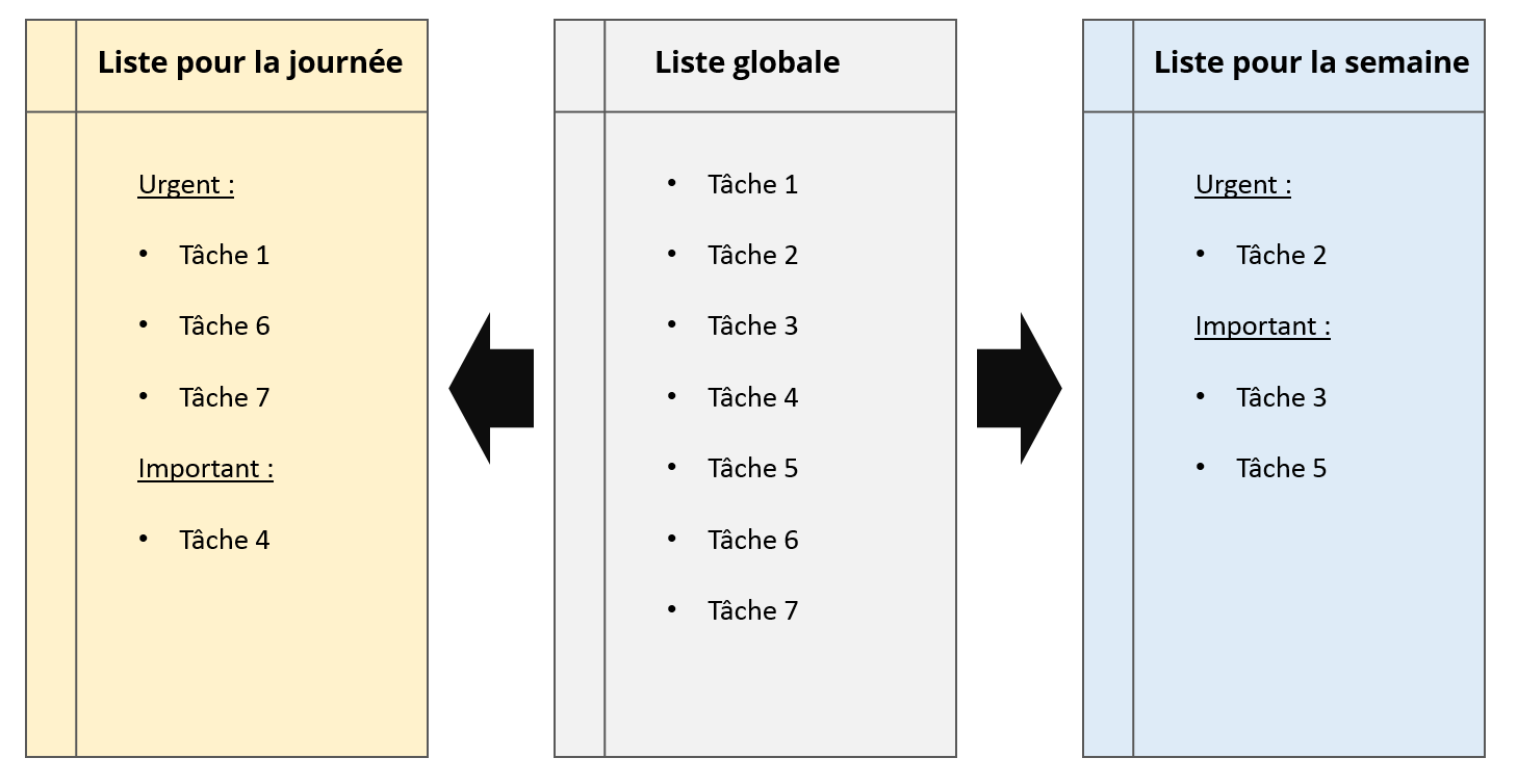 Afin de gérer efficacement votre to-do list, vous pouvez effectuer des planifications journalières ou hebdomadaires pour une bonne organisation du court terme. Au début de chaque période de planification, vous transférez les tâches en suspens de votre liste générale vers une liste quotidienne ou hebdomadaire. Le principe d’Eisenhower, du nom de l’ancien président américain souvent cité dans le domaine, propose de prioriser d’abord les tâches les plus urgentes/importantes.